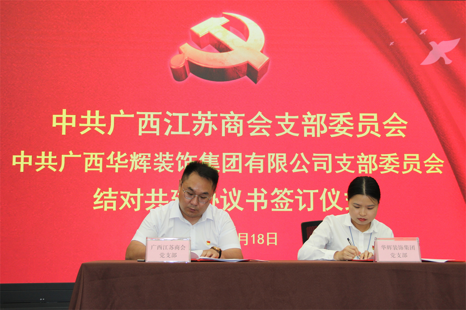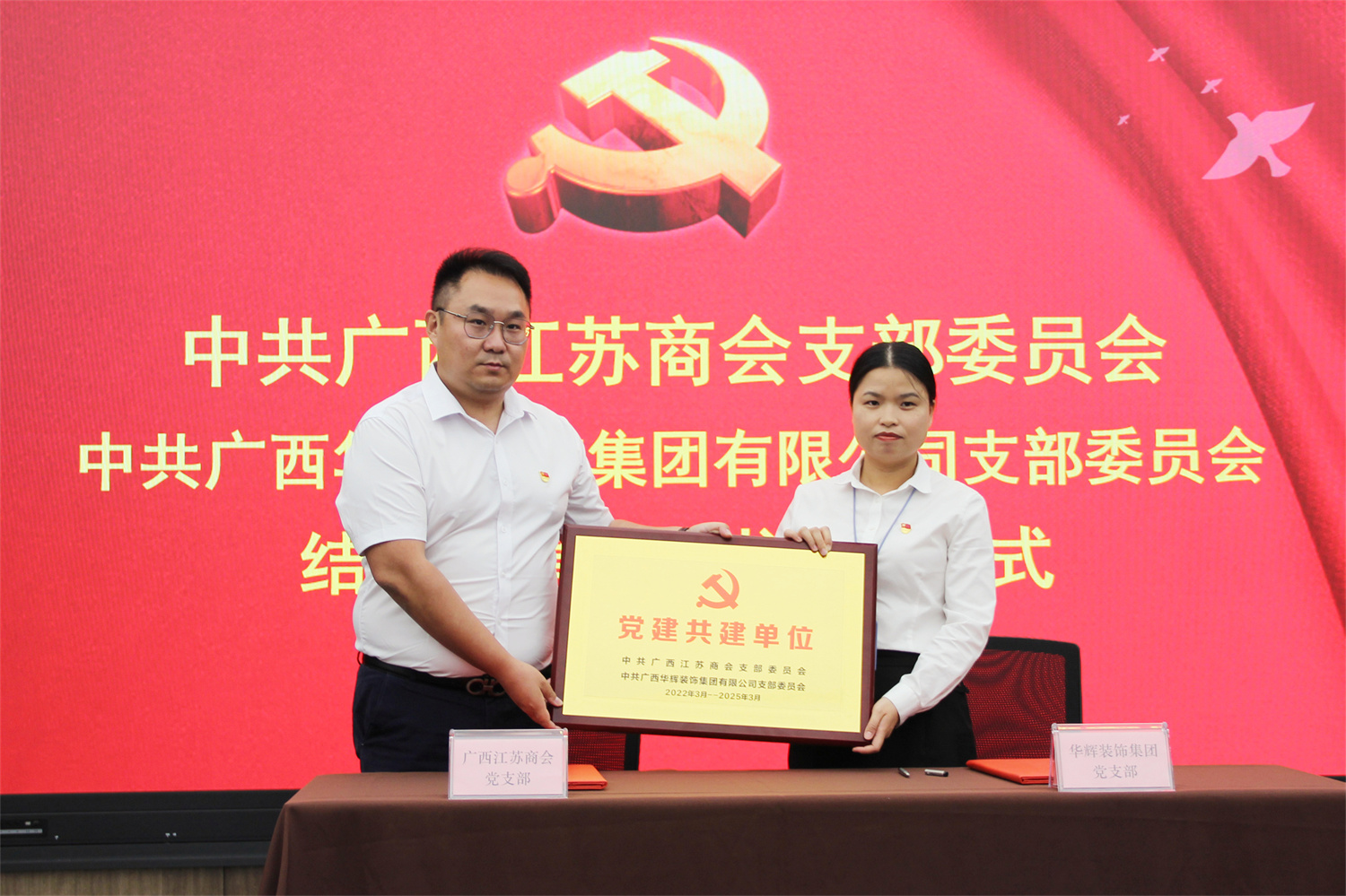 签约仪式上,商会党支部书记王伟、leyu装饰集团党支部书记刘萍东签订了结对共建协议,并由王伟同志代表广西江苏商会党支部向广西leyu装饰集团有限公司党支部赠牌。