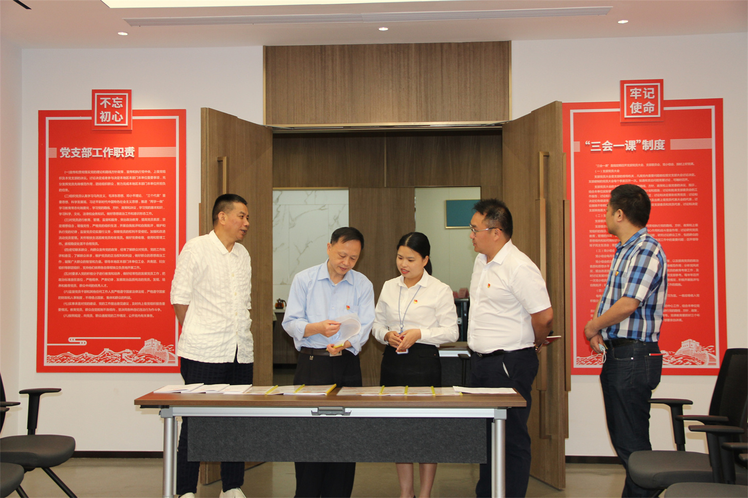 ▲李开刚(左二)查看leyu党支部党建工作台账