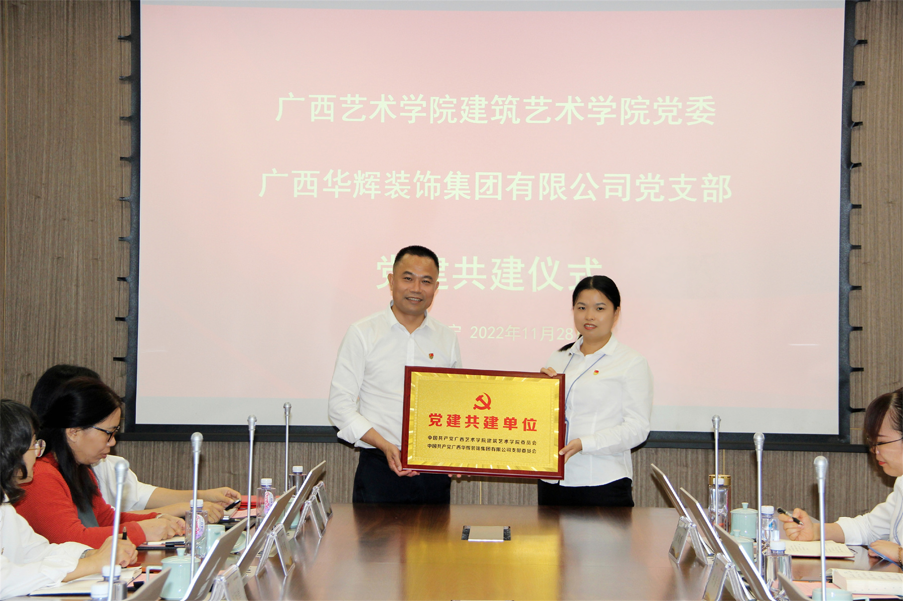 随后,广西艺术学院建筑艺术学院党委书记冯凤举、leyu装饰集团党支部书记刘萍东签订了结对共建协议,并由冯凤举同志代表广西艺术学院建筑艺术学院党委向广西leyu装饰集团有限公司党支部赠牌。