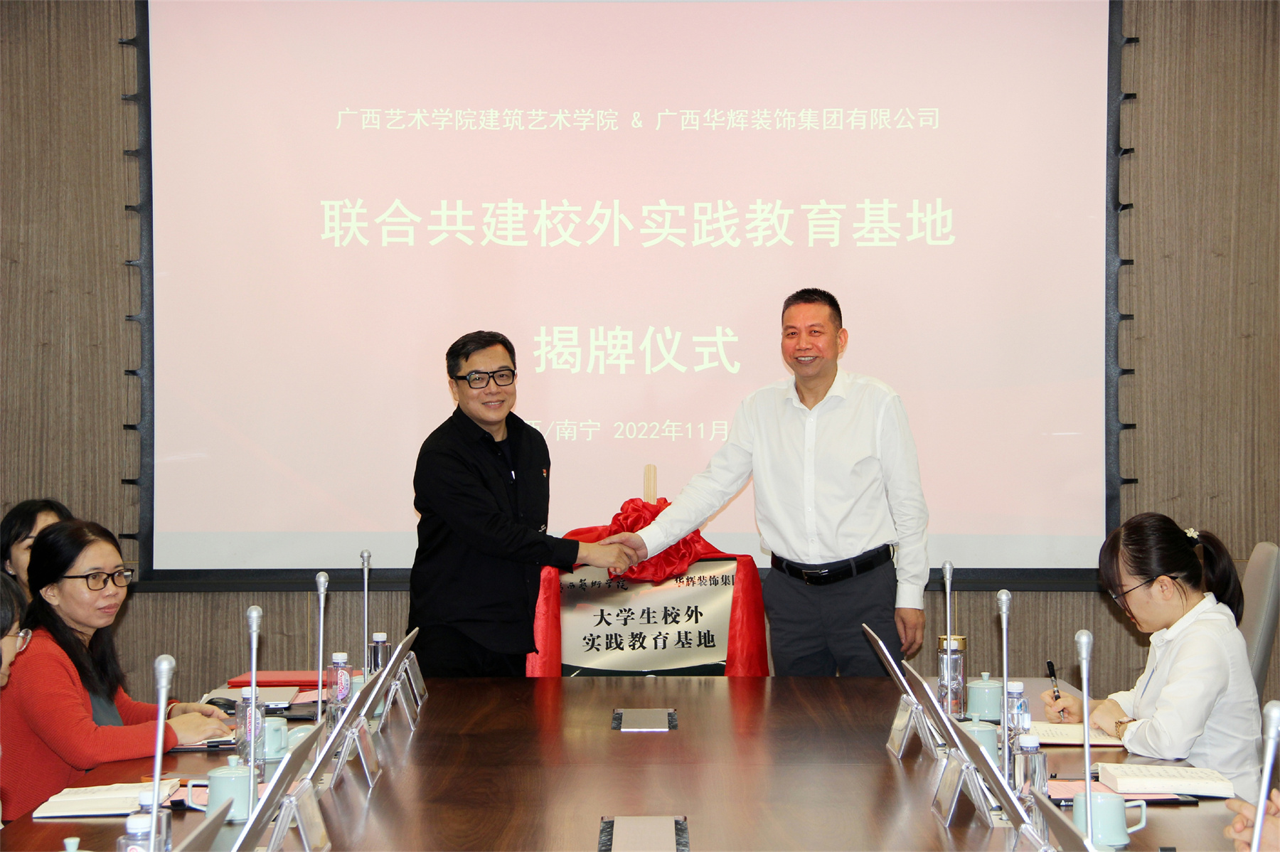紧接着,广西艺术学院建筑艺术学院院长林海、leyu装饰集团董事长杨景忠,共同为“联合共建校外实践教育基地”揭牌。
