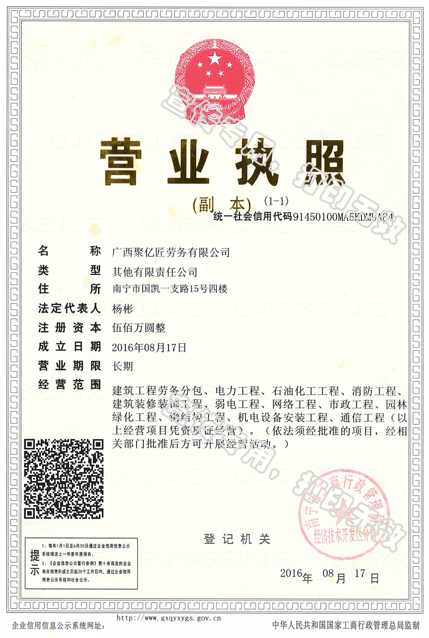 2017年5月15日,通过公司领导和同仁的努力,leyu集团旗下广西聚亿匠劳务公司成功通过申报建筑业企业资质证书的行政许可审查,取得该项资质。
