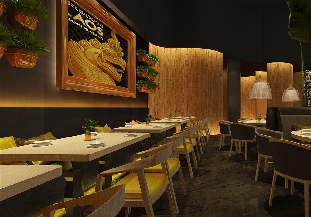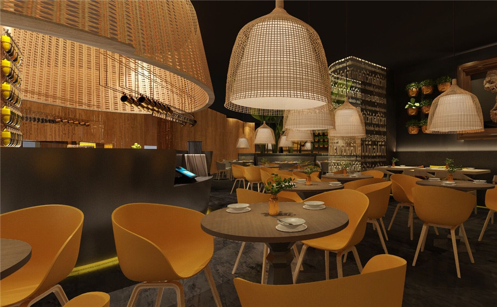 本项目融入大量的泰国元素:手工竹艺编织的收银台顶超大灯罩及小吊灯灯罩、木艺雕刻、芭蕉树、装饰画、绿植等,演绎原汁原味的泰国风情。色泽上大多采用原木色调及泥土褐色,散发着浓烈的自然气息,搭配明艳的黄色,自然温馨中不失欢跃之感。自然、热情、独特,这是大景倾情打造的地道真实的泰国味道。