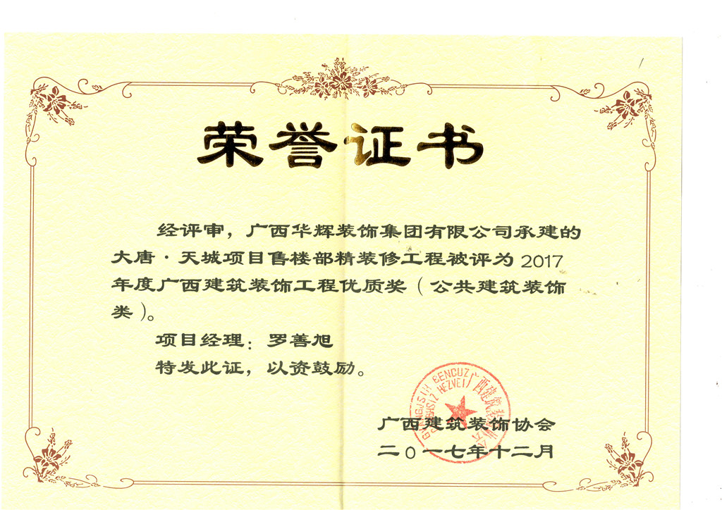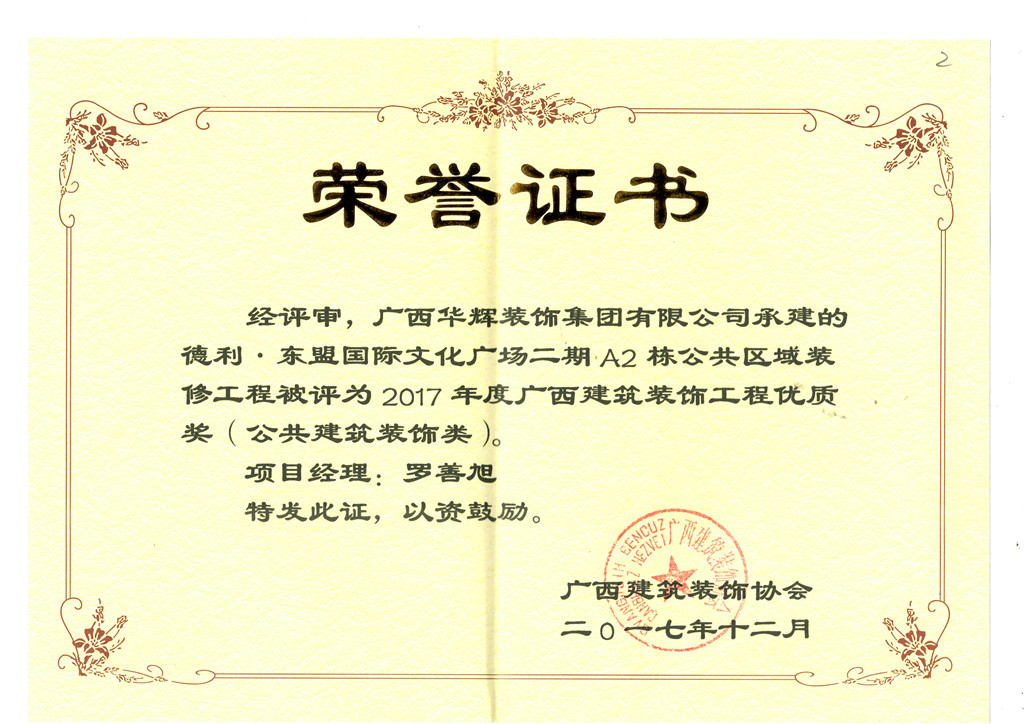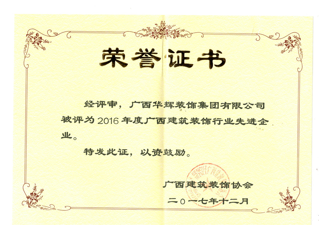 12月,leyu集团获得了“2017年度广西建筑装饰工程优质奖(公共建筑装饰类)”、“2016年度广西建筑装饰行业先进企业”、“2016年度广西建筑装饰行业优秀企业经理”及“2016年度广西建筑装饰行业优秀建筑装饰设计师”荣誉称号。