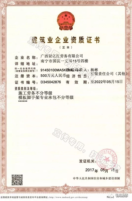 5月,leyu旗下广西聚亿匠劳务公司成功申报建筑业施工劳务资质。