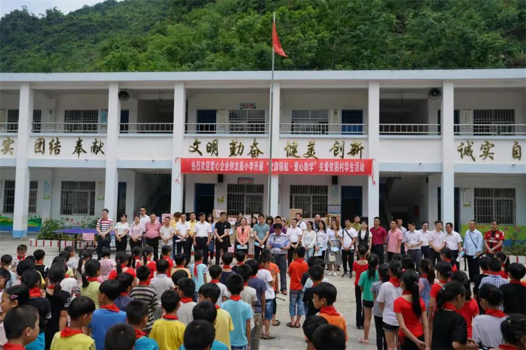 ▲在龙昌小学开展“党旗领航·爱心助学”关爱贫困村学生活动