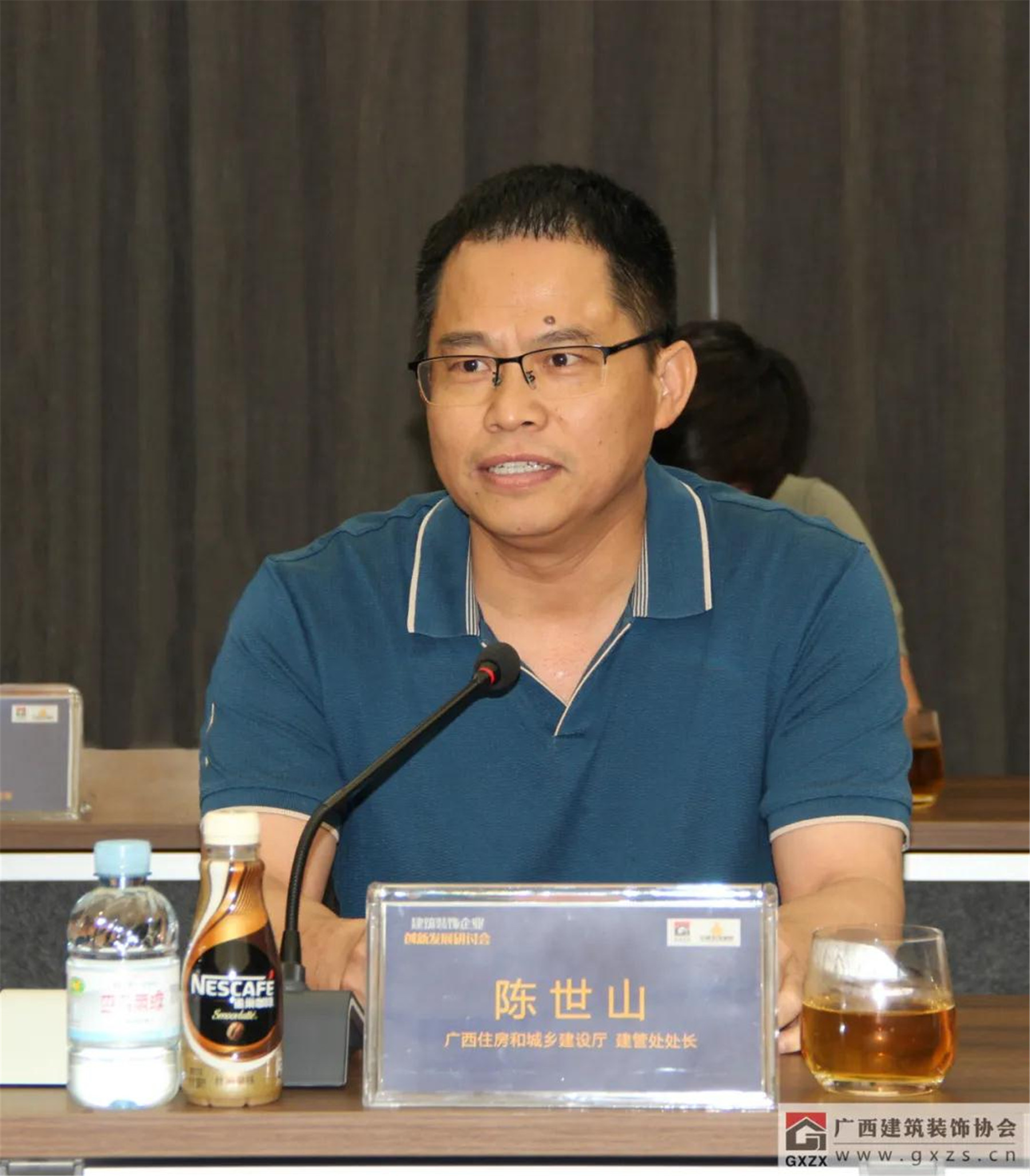 广西住房和城乡建设厅建筑市场监管处处长陈世山应邀出席会议并做指导讲话。他在讲话中表示,很高兴能够参加这次研讨会,会议的主题与建筑装饰行业发展的现状很契合,找准了行业发展面临的主要问题以及今后发展的方向。他谈到,去年广西建筑业税收占比为10.3%,凸显了建筑业在广西经济发展中的地位越来越重要,自治区党委、政府对建筑业发展给予高度重视,不久前专门召开厅际联席会以及全区建筑业高质量发展大会,研究建筑业高质量发展问题以及相关扶持政策。装饰装修行业作为建筑业的一个组成部分,是一项非常有意义的事业,按照去年的统计数据,装饰业产值在广西建筑业产值中所占的比例较小,说明还具有较大的发展空间,希望广西建筑装饰企业在广西建筑装饰协会的带领下,对自身工作多宣传,树立装饰装修行业在社会公众中的新形象,促进行业健康发展,达到各方多赢的局面。广西建筑装饰协会作为行业协会,要多了解企业情况,积极向政府部门反馈企业面临的,需要解决的问题,争取相关的政策支持,同时也要组织会员企业走出去,向先进地区的优秀企业学习取经,帮助本土企业的发展壮大。协会在这方面做了一定的工作,去年组织的深圳头部装饰企业与广西头部装饰企业结对子的活动,就是一个很好的尝试。广西住建厅也准备在国内5个城市建立服务点,协调当地相关政府部门,为广西企业走出去提供助力。同时,也鼓励外省优秀企业进入广西市场,参与广西建设。希望广西的头部装饰企业发挥自己的影响力,体现自身价值,促进广西建筑装饰行业高质量发展。