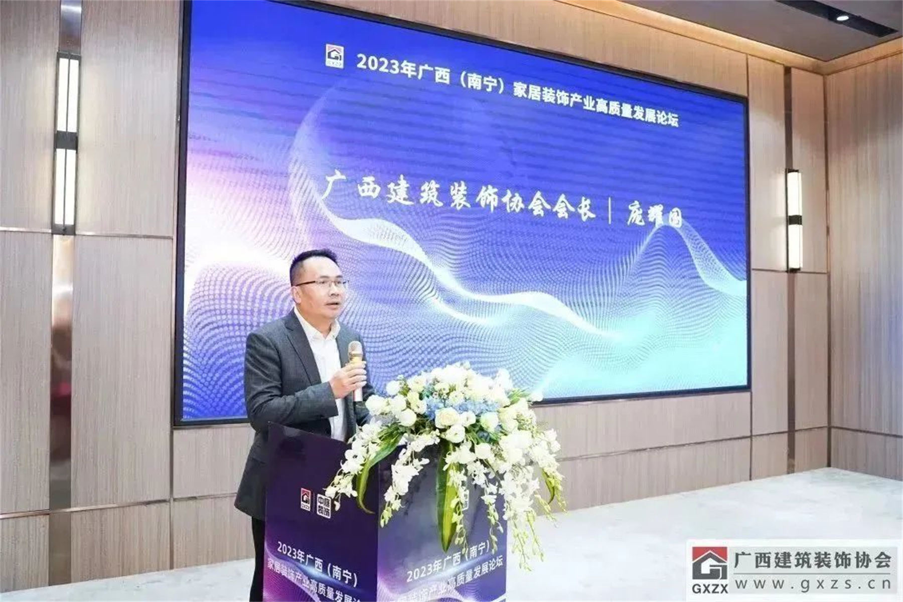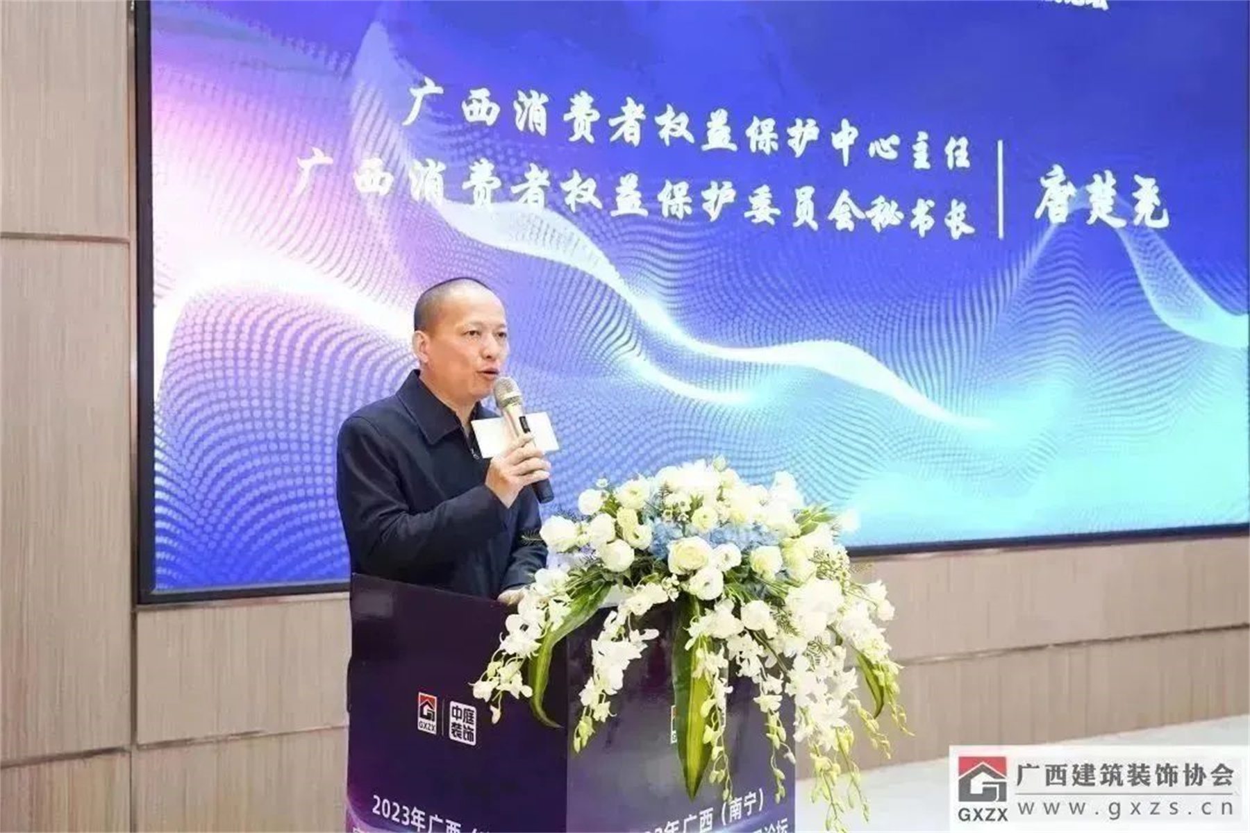 2023年2月27日,由广西建筑装饰协会主办的,2023年广西(南宁)家居装饰产业高质量发展论坛在南宁成功举办。广西消费者权益保护中心主任、广西消费者权益保护委员会秘书长唐楚尧、广西消费者权益保护中心(广西消费者权益保护委员会秘书处)消费指导与质量监督部主任李竞莹受邀出席活动。协会会长庞耀国、副会长杨景忠、谢嘉、秘书长谭谦、广西头部住宅装修企业负责人、来自协会约30家会员企业的代表等共100余人参加会议。