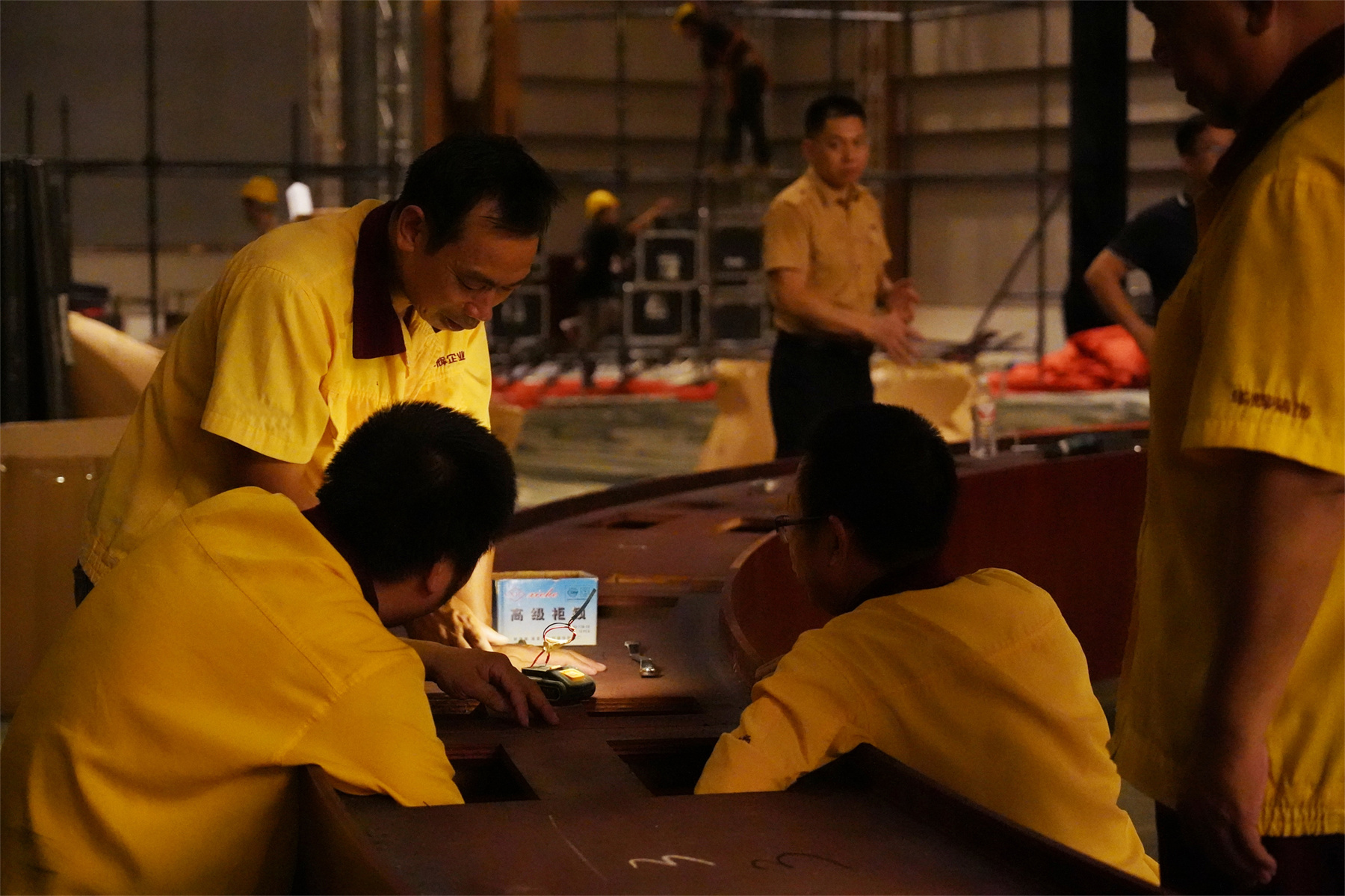 接到任务后,leyu深感使命光荣、责任重大。大圆桌直径12米,周长37.69米,超大型的弧形结构增加了生产难度,且工期非常紧张。为有效缩短工期,leyu采用工厂工业化部品部件,将超大型的弧形结构逐一分解,拆分工艺、结构和形体。
