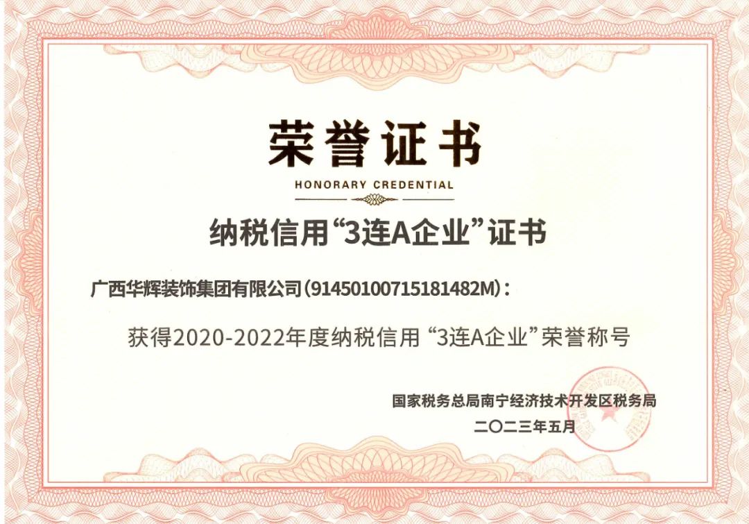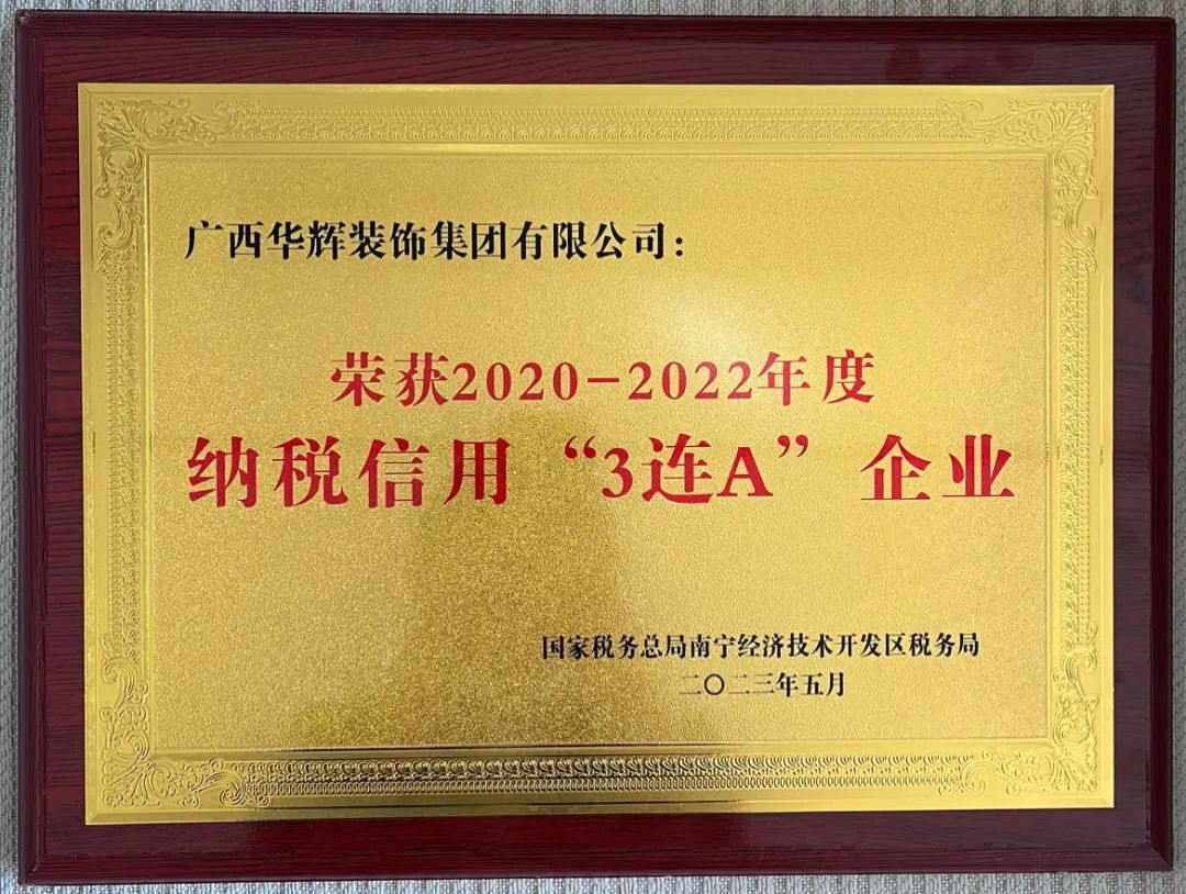 近日,广西leyu装饰集团凭借良好的纳税信誉,获得国家税务总局南宁经济技术开发区税务局2020-2022年度纳税信用“3连A企业”荣誉称号。