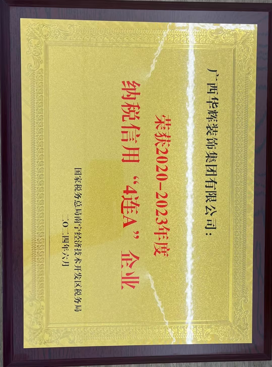 近日,广西leyu装饰集团凭借良好的纳税信誉,获得国家税务总局南宁经济技术开发区税务局2020-2023年度纳税信用“4连A企业”荣誉称号。