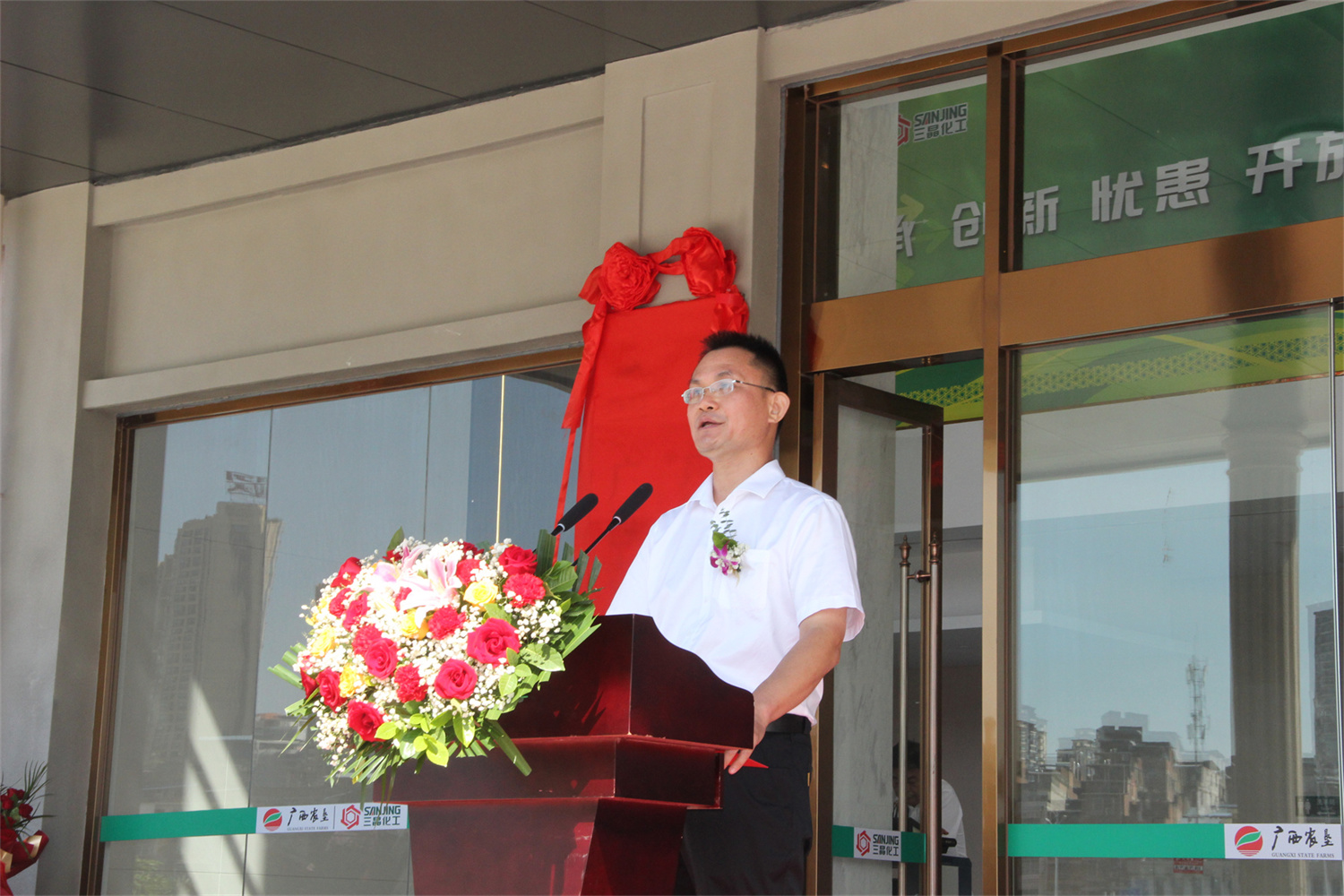 揭牌仪式上,广西化工研究院公司党委书记、董事长、院长赖开平致辞。化工院成立至今,始终坚持创新赋能、科学发展,将科技创新作为促产兴院的法宝,强科研,促转化,兴产业,各项事业取得长足进步,如今已构建以“名优产品为龙头、多产业板块齐头并进”的产业格局。科技园办公区以及科技综合楼的正式揭牌启用,是化工院发展史上具有里程碑意义的一件大事,标志着化工院整体创新能力实现了跨越式提升,企业发展迈出了更加坚实的一步。化工院将坚持以习近平新时代中国特色社会主义思想为指导,贯彻落实习近平总书记关于广西工作论述的重要要求,深入学习贯彻党的二十届三中全会关于“深化国资国企改革”精神,贯彻落实广西农垦集团的战略部署,紧盯营收、利润目标任务,立足产业拼效益,加快木薯多糖铁新产品市场布局,有序加快产品研发引领产业发展,坚决完成全年经营目标任务。